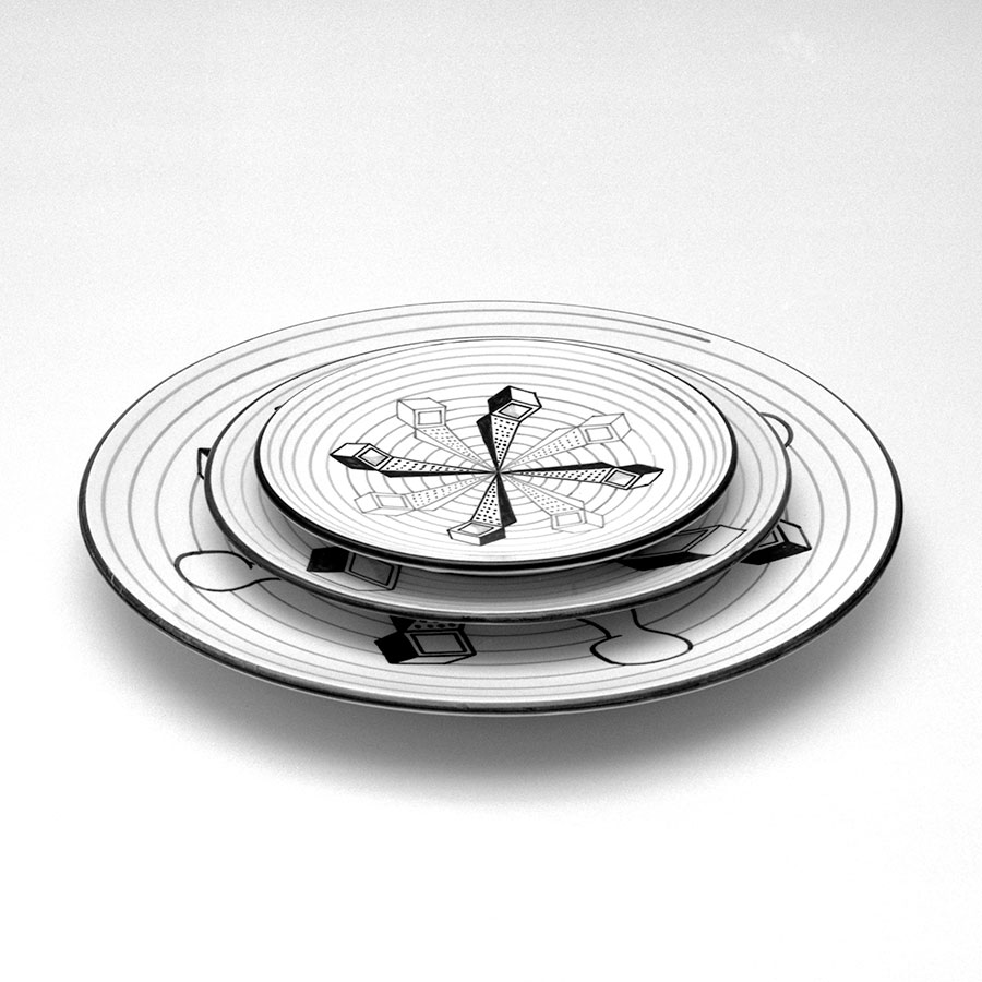 Die in Bezug auf meine sonstige künstlerische Arbeit etwas ungewöhnlich erscheinende Beschäftigung mit Keramik beruht auf einem glücklichen Zufall. Die Idee für beide Keramiksets bekam ich während eines Tunesienurlaubs, als sich mir die Möglichkeit bot, in einer der größten Keramikfabriken des Landes arbeiten zu können. Es hatte für mich einen besonderen Reiz das landesübliche, folkloristische Blumendekor durch außergewöhnliche, technoide Piktogramme zu ersetzen.